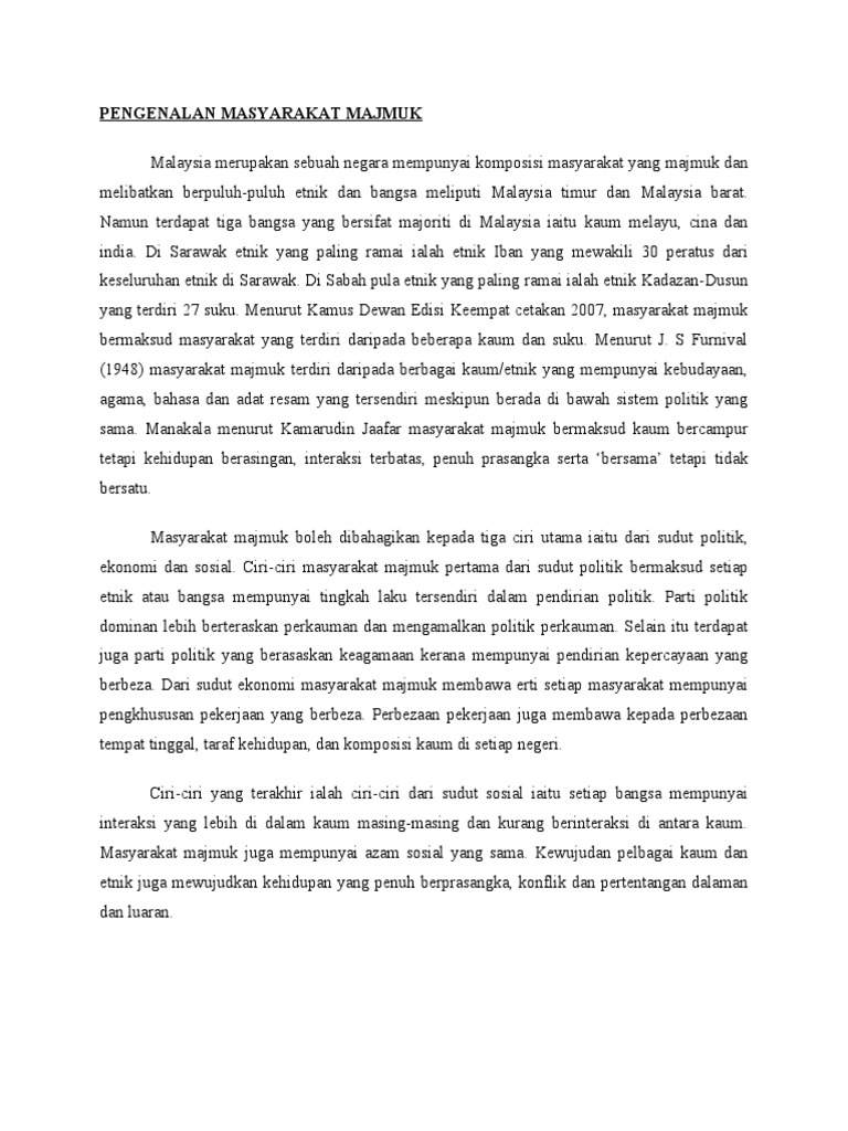 . Masyarakat majmuk boleh dibahagikan kepada tiga. JSFurnivall merupakan orang pertama yang mengemukakan konsep masyarakat majmuk berdasarkan kajiannya di Indonesia dan BurmaMenurut Furnivall 196754. Masyarakat majmuk ialah masyarakat yang terdiri daripada pelbagai kaum yang mempunyai budayaagamabahasaadat.