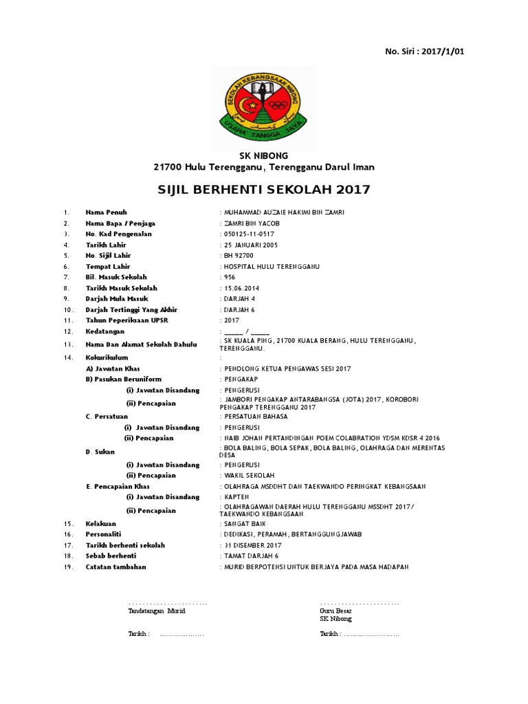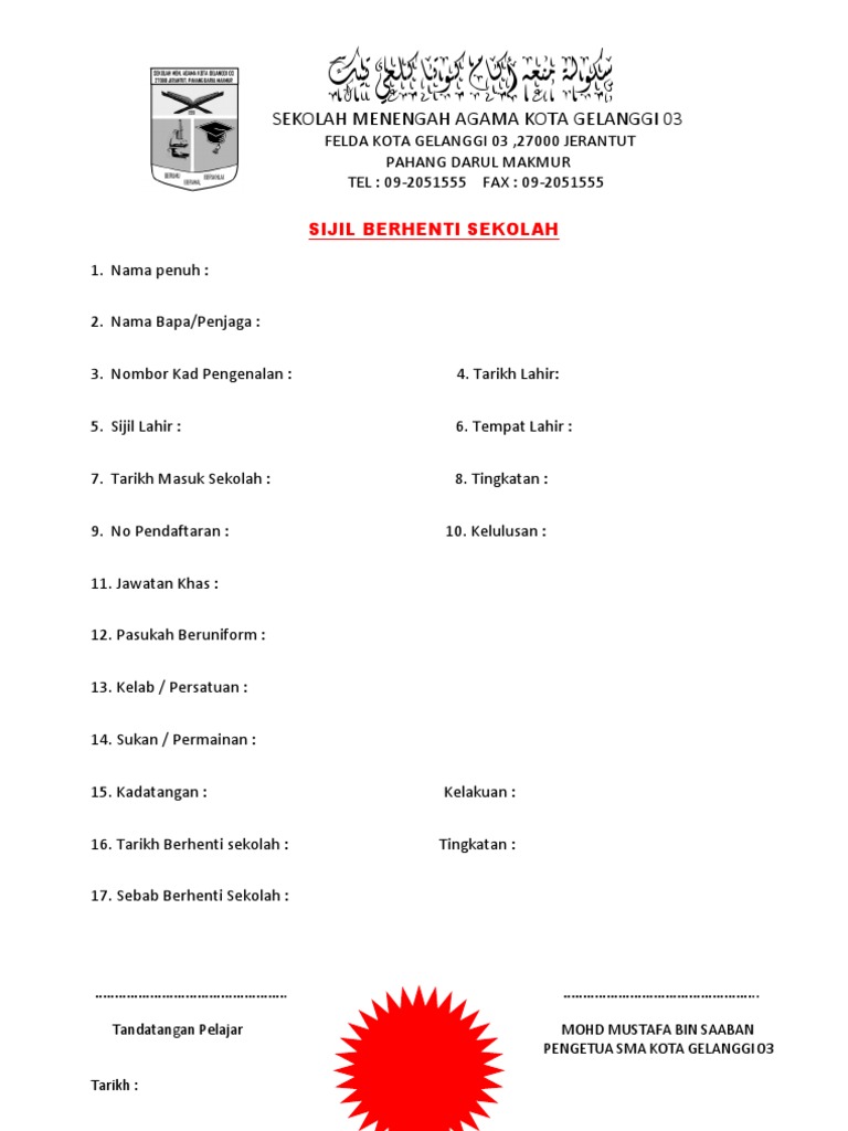 MUHHAMAD ZULHILMI BIN MD KHIR ZUHARI No Kad Pengenalan. Telah tamat persekolahan sehingga tingkatan 5. Contoh sijil berhenti sekolah humphreycda tarikh.